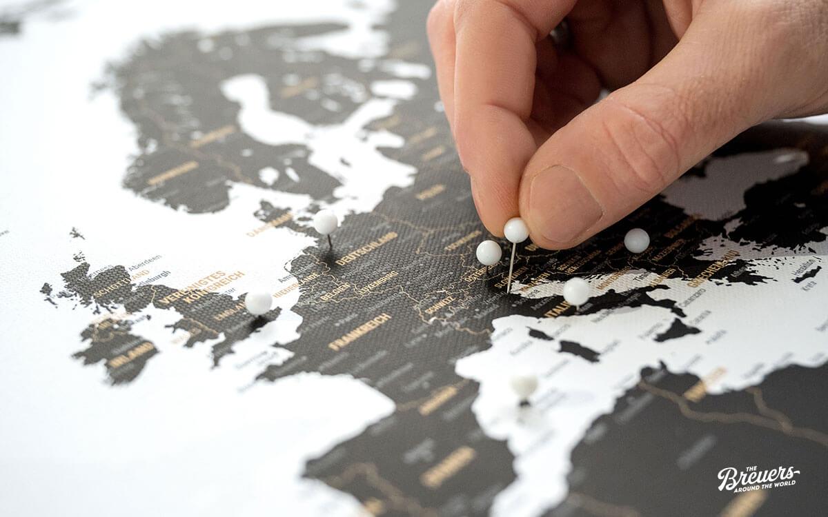Besides travelling, photographing and blogging, we also love designing travel maps. In our factory, we create 100% handmade world maps, USA travel maps and European maps as pin canvases, posters or magnetic posters. The modern, simple design puts the focus on the colour-matched pins that you can use to document all your travel adventures.